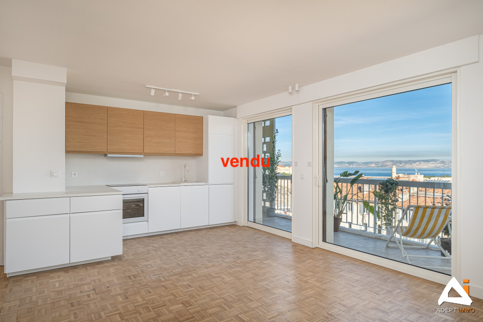 Bd de la Corderie, au niveau de St Victor, dans bel immeuble STANDING, grand T3 71m2 RENOVE A NEUF avec VUE PANORAMIQUE + TERRASSE de 8,5m2, 2 BALCONS et PARKING en sous sol (38 000€ en sus). Cet appartement en etage élevé (6eme av. asc) dispose d'une belle pièce de réception de 32m2, ouvrant avec 2 baies vitrées à galandage, sur la TERRASSE et une VUE exceptionnelle sur la MER, ville et ses monuments emblématiques: Fort St jean, palais du pharo, cathedrale de la Major, Fort entrecasteaux ... La cuisine totalement équipée à neuf, ouverte sur le séjour, bénéficie de ces "tableaux", décor vivant qui évolue selon les heures pour terminer par un soleil couchant et une ville éclairée . La TERRASSE de 8,5m2 permet de savourer, à table ou dans un transat, mais le canapé du salon profitera du même spectacle!!! Les deux grandes chambres (18 et 13 m2) sont agencées de dressings, une dispose d'un espace bureau et chacune ouvre, par de larges portes vitrées, sur un BALCON (2 balcons), permettant de végétaliser. La salle de bain offre baignoire et douche à l'italienne, plus double vasques. Le wc est indépendant avec lave mains. L'ensemble est parqueté en chêne massif et climatisé. Les baies sont en double vitrages pour un CONFORT optimal, avec des volets roulants electriques. Cave et PARKING en sous sol (38000€ en sus) sont accessibles directement par ascenseur. L'appartement, résidence d'une unique proprietaire parce que l'adresse ne se quitte pas...., vient d'être RENOVE totalement. On apprécie une decoration actuelle et des aménagements totalement neufs: electricité, plomberie, peintures, huisseries, volets roulants, electromenager, sanitaires, climatiseurs.....! Prêt à vivre, RARE! NB: le bien est la propriété du gérant de l'agence immobilière (par l'intermediare d'une société dont il est le gérant)