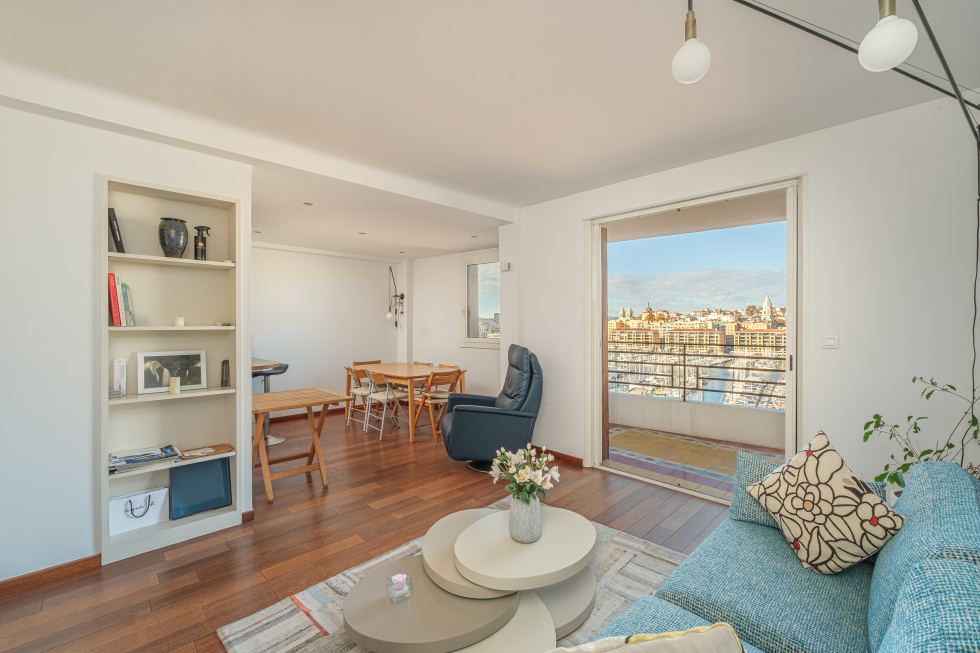 7ème étage av asc, T3 PARFAIT ETAT. La pièce de vie et TERRASSE adisposent d'une VUE majestueuse sur le Vieux-Port! La réception baignée de LUMIERE, ouvre sur la TERRASSE, par une baie vitrée en galandage, effaçant la frontière entre intérieur et extérieur. La salle à manger s'ouvre harmonieusement sur une cuisine contemporaine, créant un environnement fonctionnel et convivial. Une bibliothèque sur mesure dans le salon renforce le caractère unique du lieu. L'espace nuit se compose de 2 chambres élégantes équipées de clim et chacune dotée de sa propre salle d'eau, pour un CONFORT optimal et l'intimité de chacun Aucun travaux à prévoir : l'appartement est prêt à accueillir ses futurs occupants. Une cave en sous sol complète le bien. Situé dans l'un des secteurs les plus prisés de Marseille, ce superbe T3 offre un cadre de vie rare, alliant CONFORT, PRESTATIONS haut de gamme et VUE imprenable. Bien d'exception! Voir moins