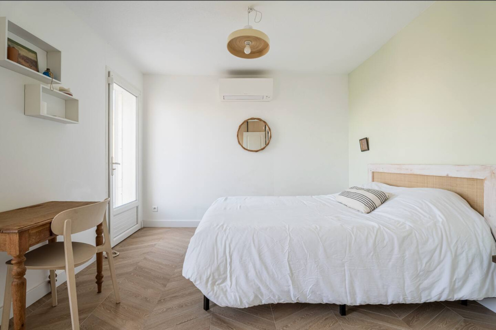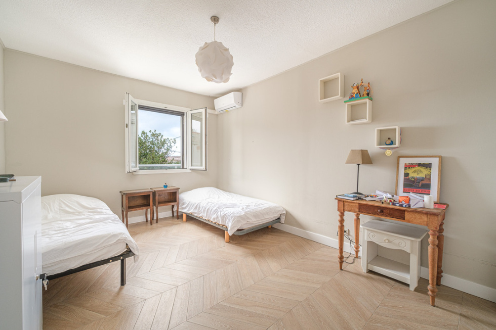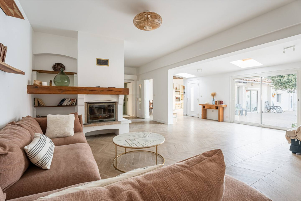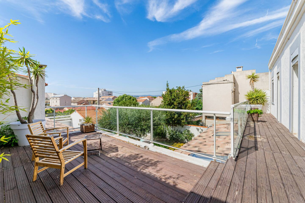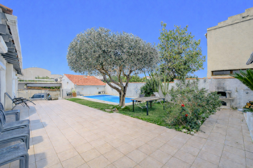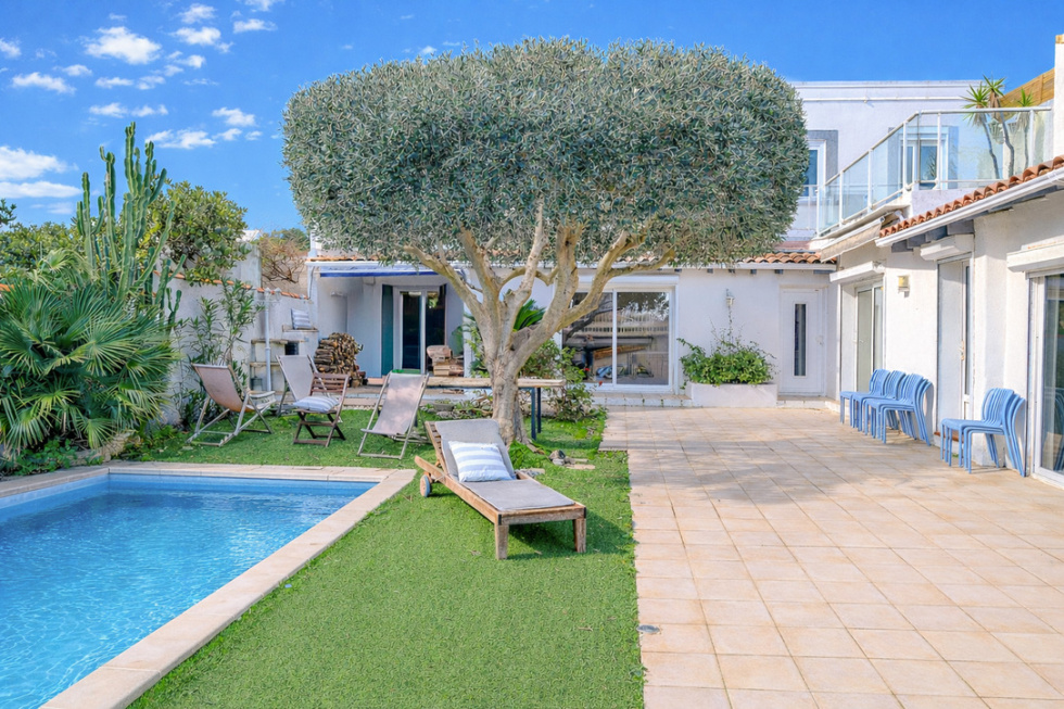 A 350m de la MER/ Plage, entre la Grotte Rolland et le port de la Madrague, au CALME, MAISON de 190m2 en TRES BON ETAT, sur un JARDIN de 400m2, avec une belle PISCINE et dépendance de 10m2, aménagée en studio. L'essentiel de la MAISON est de plain pied, tourné vers le JARDIN/piscine et le SOLEIL, telle une hacienda! Une grande et belle reception de presque 65m2 offre un LUMINEUX sejour et salle à manger avec cheminée. La cuisine contigue et ouverte offre un espace de repas supplémentaire. Toujours en rez de jardin, une autre aile de la MAISON dégage 2 chambres, SDB et une 2de cuisine!! Cet espace peut etre totalement indépendant et offrir un 2d logement pour loger un parent par exemple. Les 3 autres chambres et SDB sont à l'etage, au dessus de la pièce de vie, avec de nombreuses fenêtres et une VUE SUR LA MER. Fonctionnelle, lumineuse, spacieuce, conviviale, cette MAISON présente l'essentiel pour une famille avec enfants, grâce à ses 5 chambres, 3 SDB... et le studio indépendant qui pourrait loger une jeune fille au pair. Autres opportunités remarquables présentées par ce bien, des chambres en RDC et une division possible en 2 logements. Le JARDIN paysagé est aménagé d'une PISCINE au sel et d'un PARKING. Les heureux propriétaires pourront apprécier ce quartier convoité, aux airs de vacance et rejoindre notamment la plage à moins de 5mn à pied, profiter des calanques immediates, comme des commodités du quartier avec les commerces à 5mn à pieds, des ecoles à proximité, centre equestre, bus...